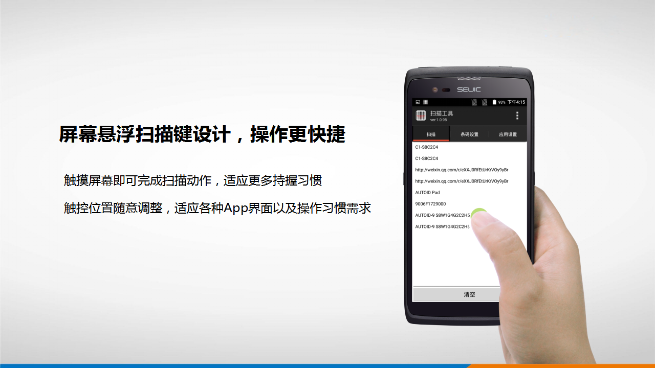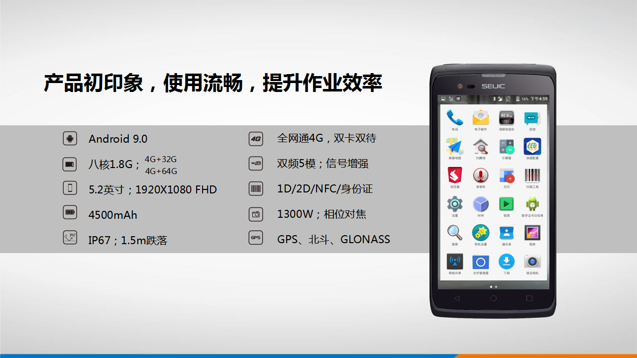 电源:可拆卸3.8V 4500mAh锂离子充电电池;底部Type C USB接口,支持QC3.0快充,智能识别PC及充电器;背部POGO PIN接口,支持底座充电,USB数据通讯及VBAT供电、扫描触发键